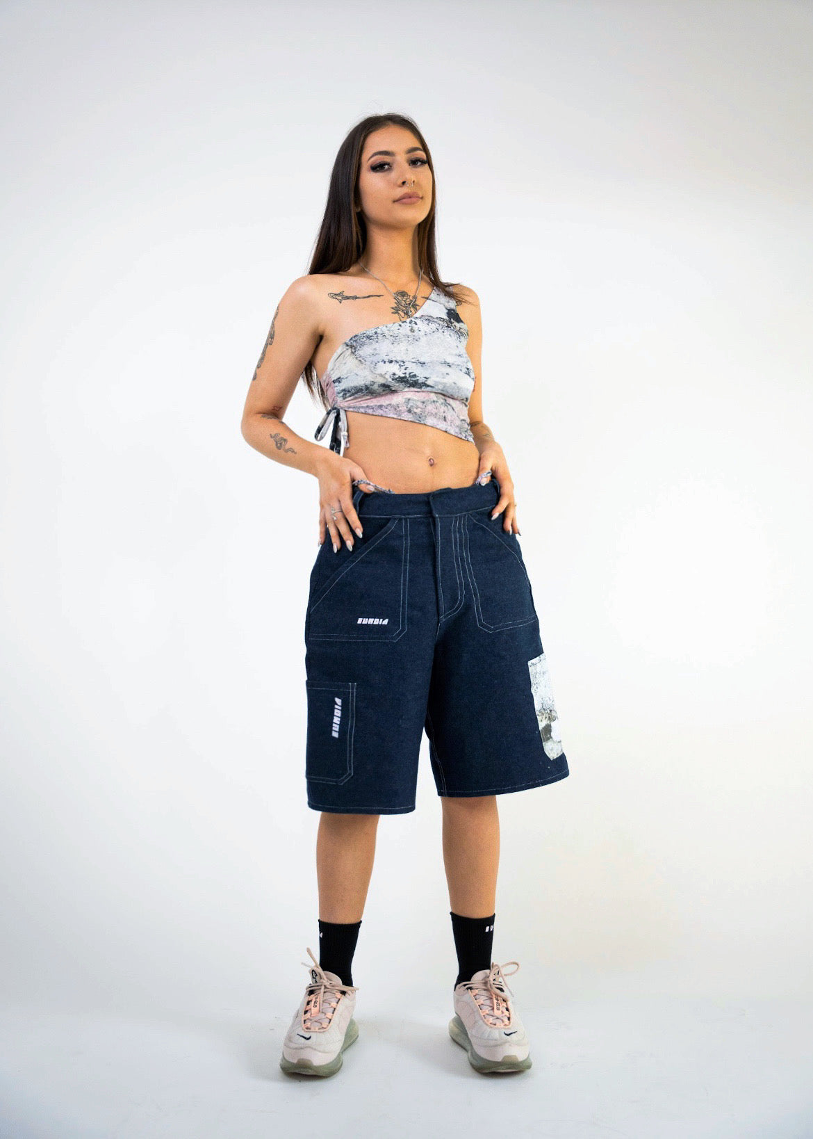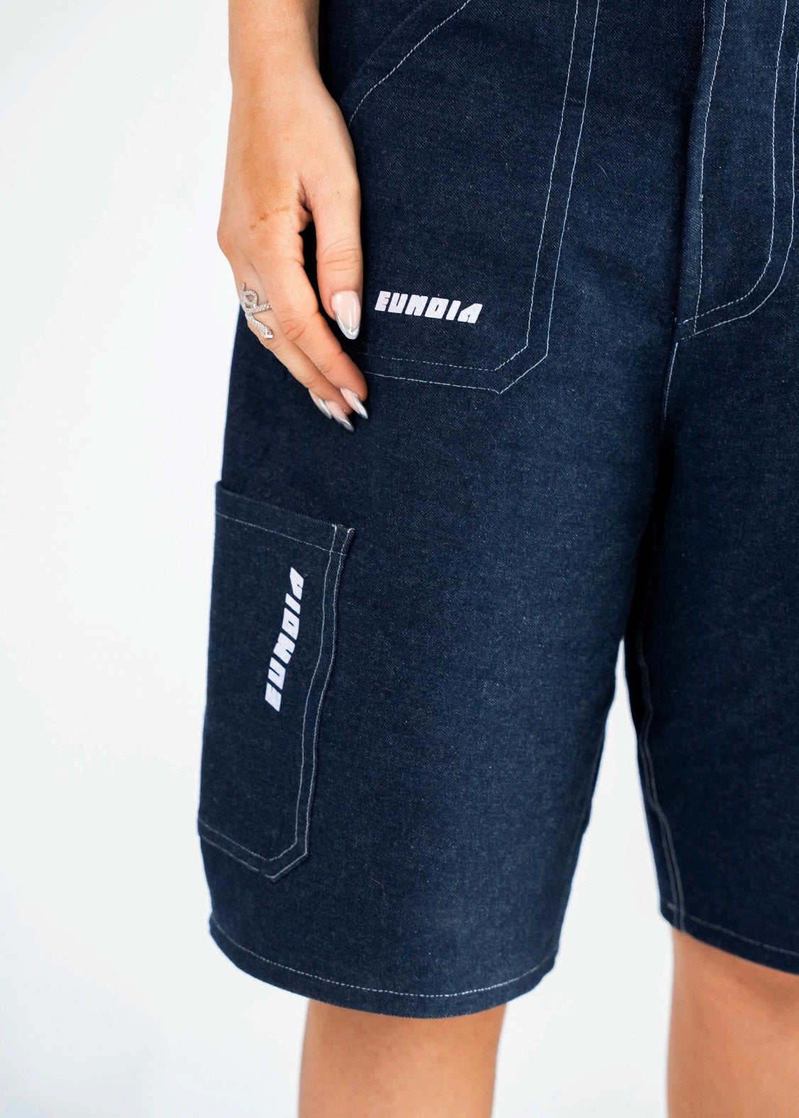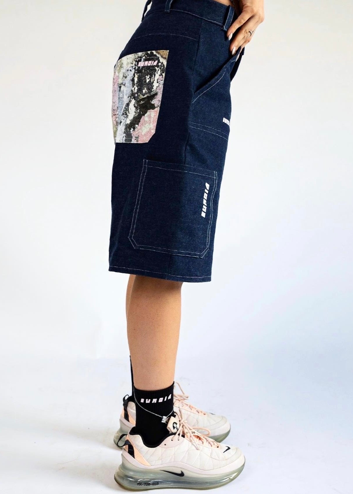 Dark Blue Heavy Denim Shorts With S/S23 Pink Print Pockets And Vinyl Logo Details
