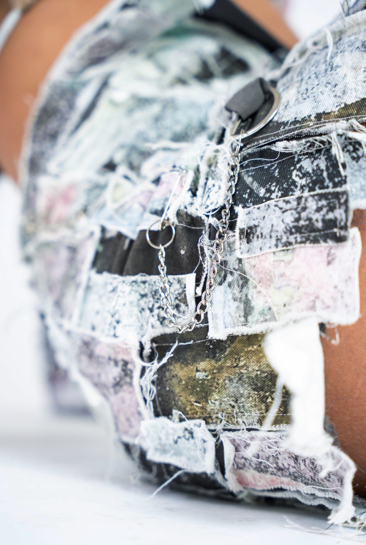 Details: Silver Rhinestone Letter ‘E’s, Safety Pins, Chains, Silver Eyelets, Up-Cycled Silver Materials