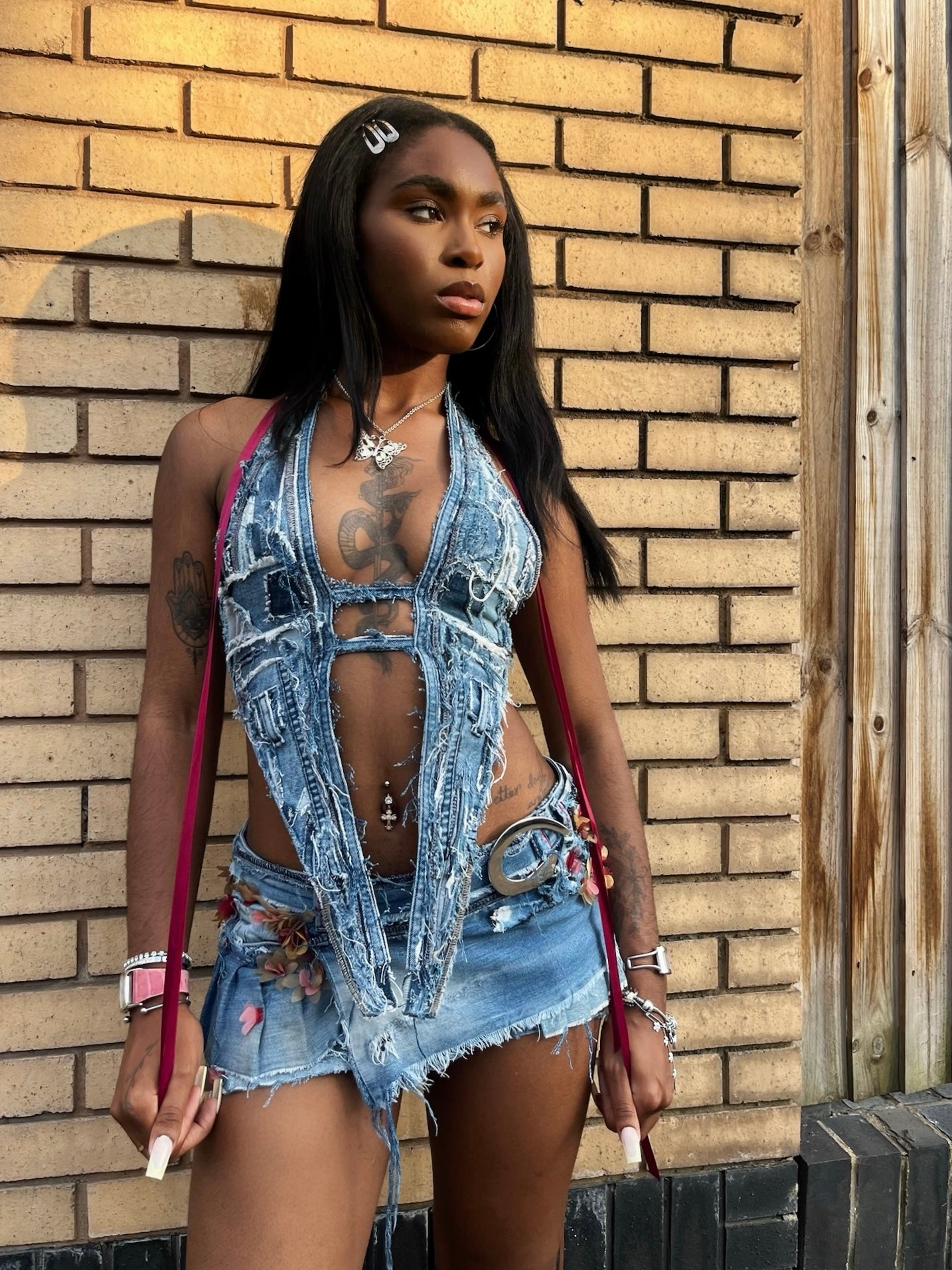 Up-Cycled Denim Floral Appliqué Pleated Mini (1of1)